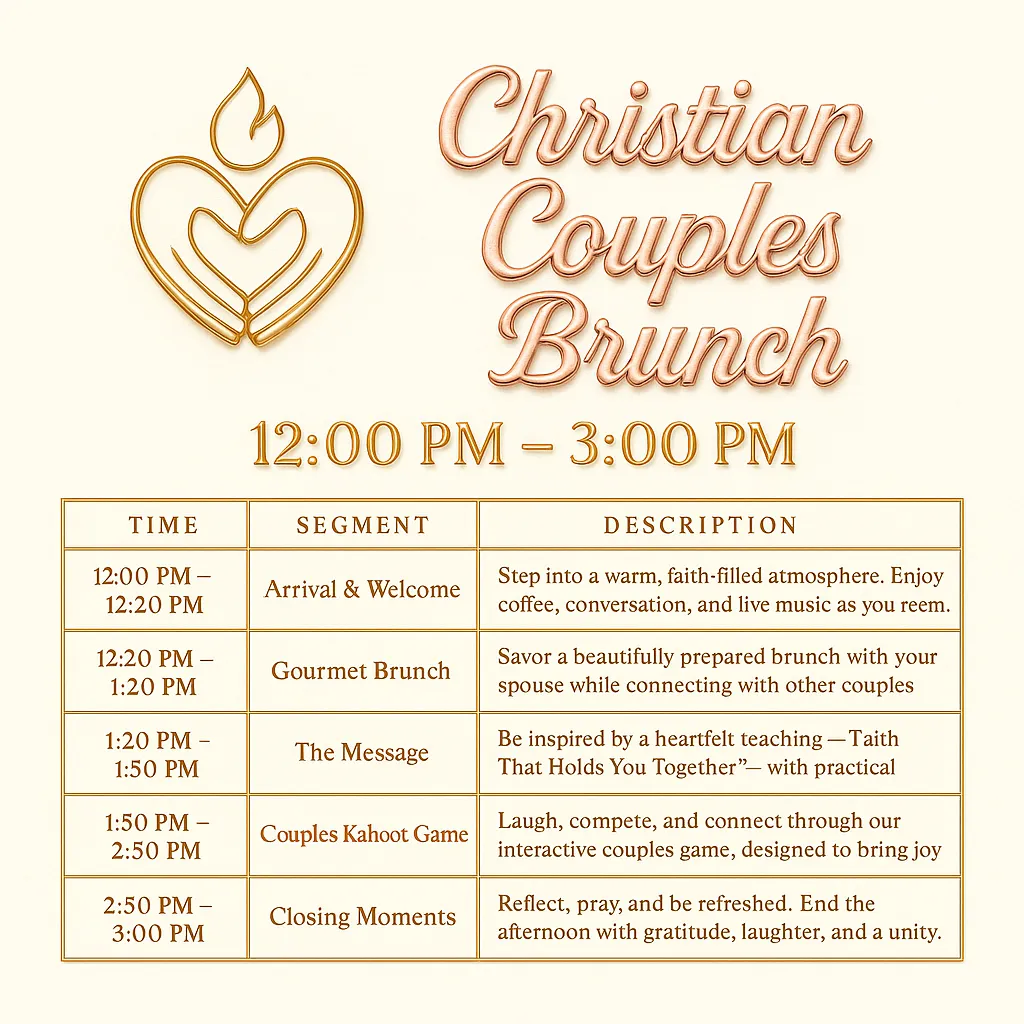 You’ll enjoy a full brunch, live music, a heartfelt teaching from Miguel & Danisha Holder, interactive activities like our Couples Kahoot Game, and time to connect with other faith-filled couples.
